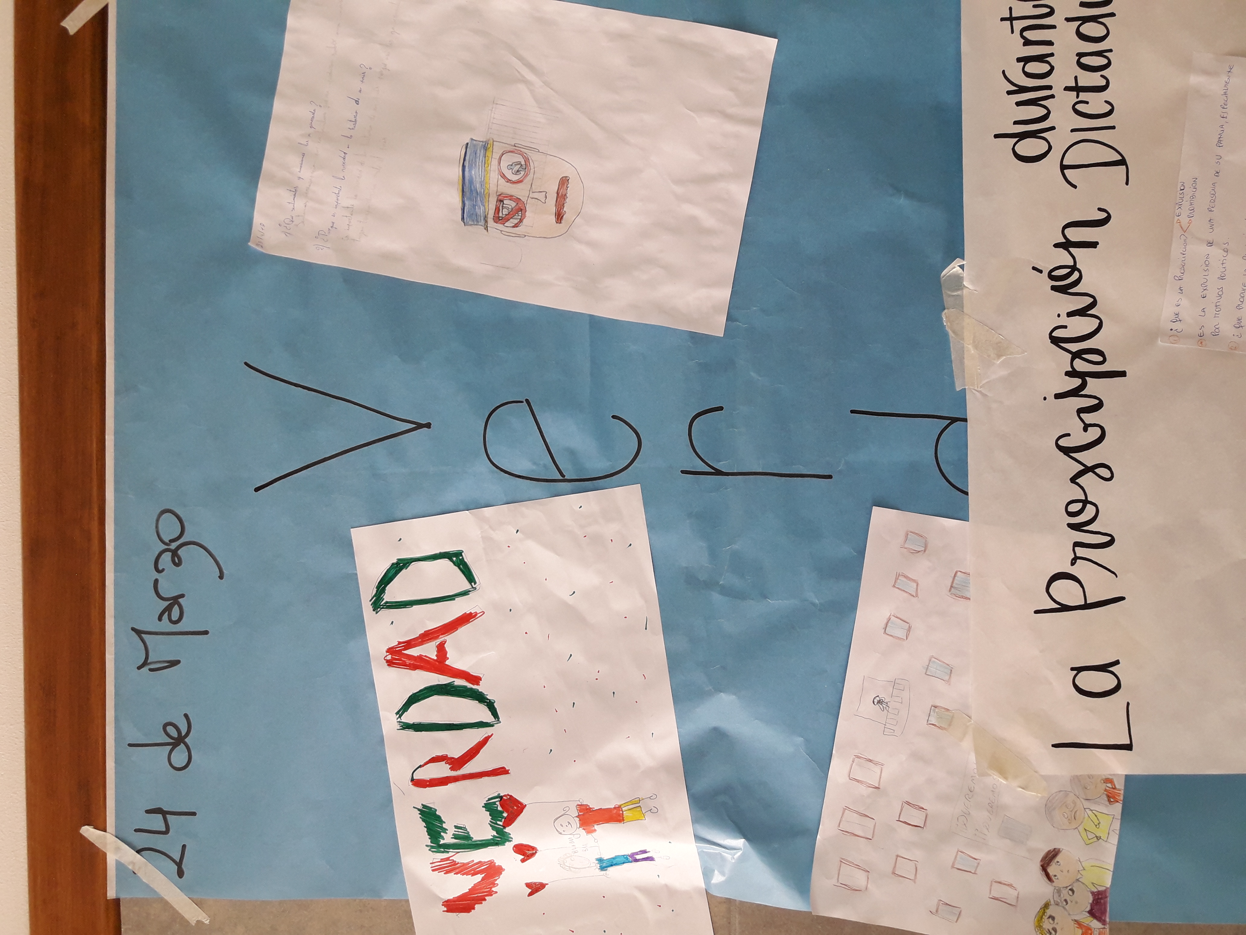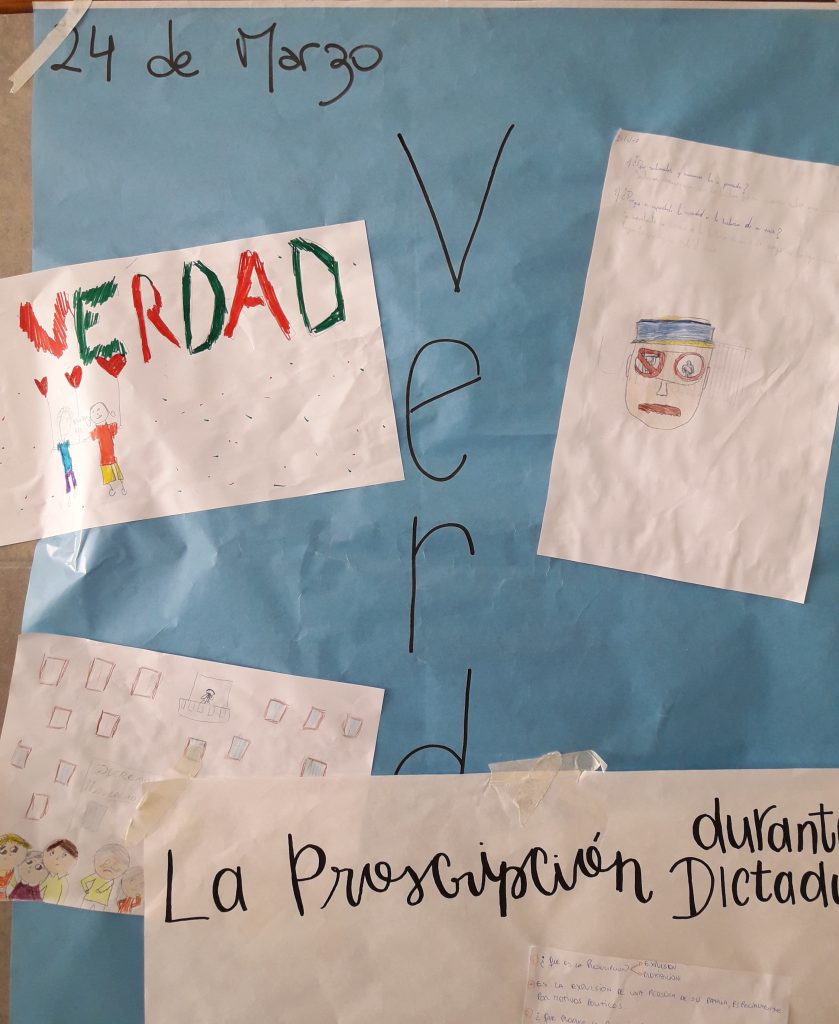 Una vez retiradas las banderas se propone a los alumnos mirar un video para contextualizar y seguir reflexionando sobre la fecha. Luego se retiran a sus salones a realizar actividades para repensar los sucesos durante la dictadura. En cada salón, con representantes del curso de segundo año y un docente, se propuso una palabra y la realización de un dibujo que la represente. Más tarde todos los dibujos se unirían en un collage.