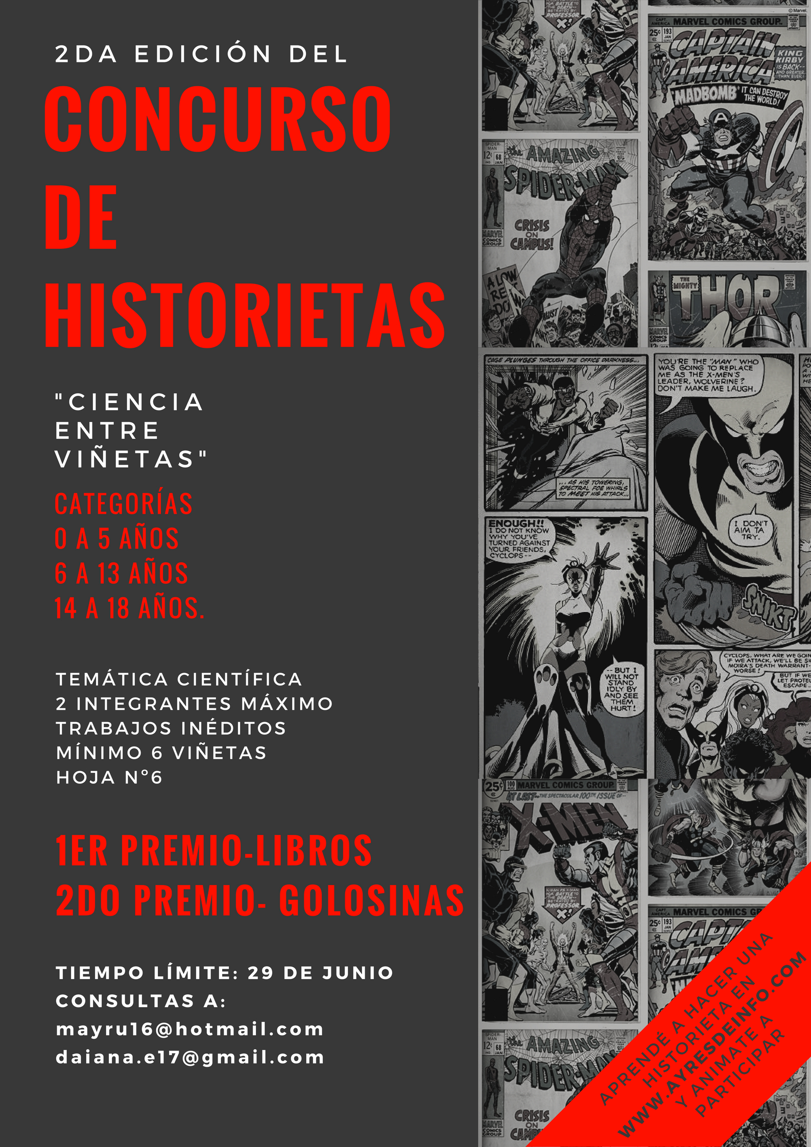 El objetivo del concurso es la producción y premiación de historietas con contenido científico, tanto de Ciencias Naturales, Ciencias Sociales, Biología, Física o Química o afines. Podrán participar todos los alumnos de 0 a 18 años, y serán divididos en tres comisiones de 0 a 5 años, de 6 a 13 años y de 14 a 18 años. Para participar se deberán tener en cuanta las siguientes pautas: